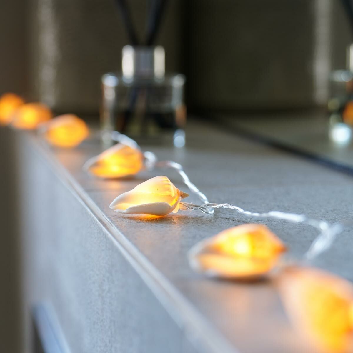Bringing a hint of the beach to your bathroom, holiday home or your book shelf, these battery string lights are the perfect addition to remind you of those walks along the beach or your time at the seaside. Along the 1.5m lit length are 10 individual real sea shells, each one encasing a delicate warm white LED bulb, which creates a lovely and delicate glow when lit. These charming lights also make a great style statement when unlit too!