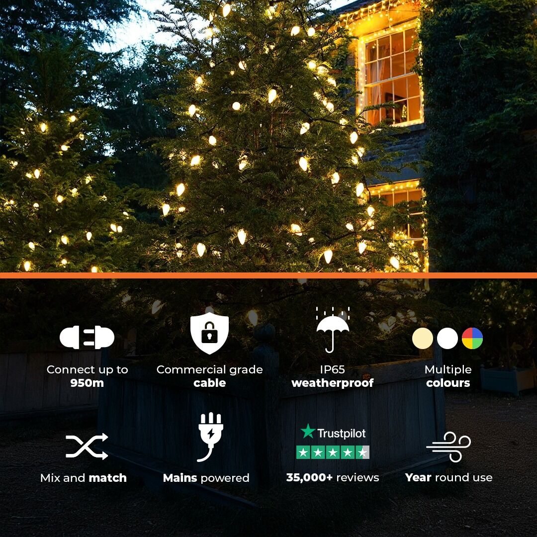 You can connect up to 950m, or 7,600 LEDs, all from one plug, making this system perfect for large commercial lighting displays. The whole system is rated IP65 and comes with a 2 year warranty, providing reassuring durability for prolonged outdoor displays.