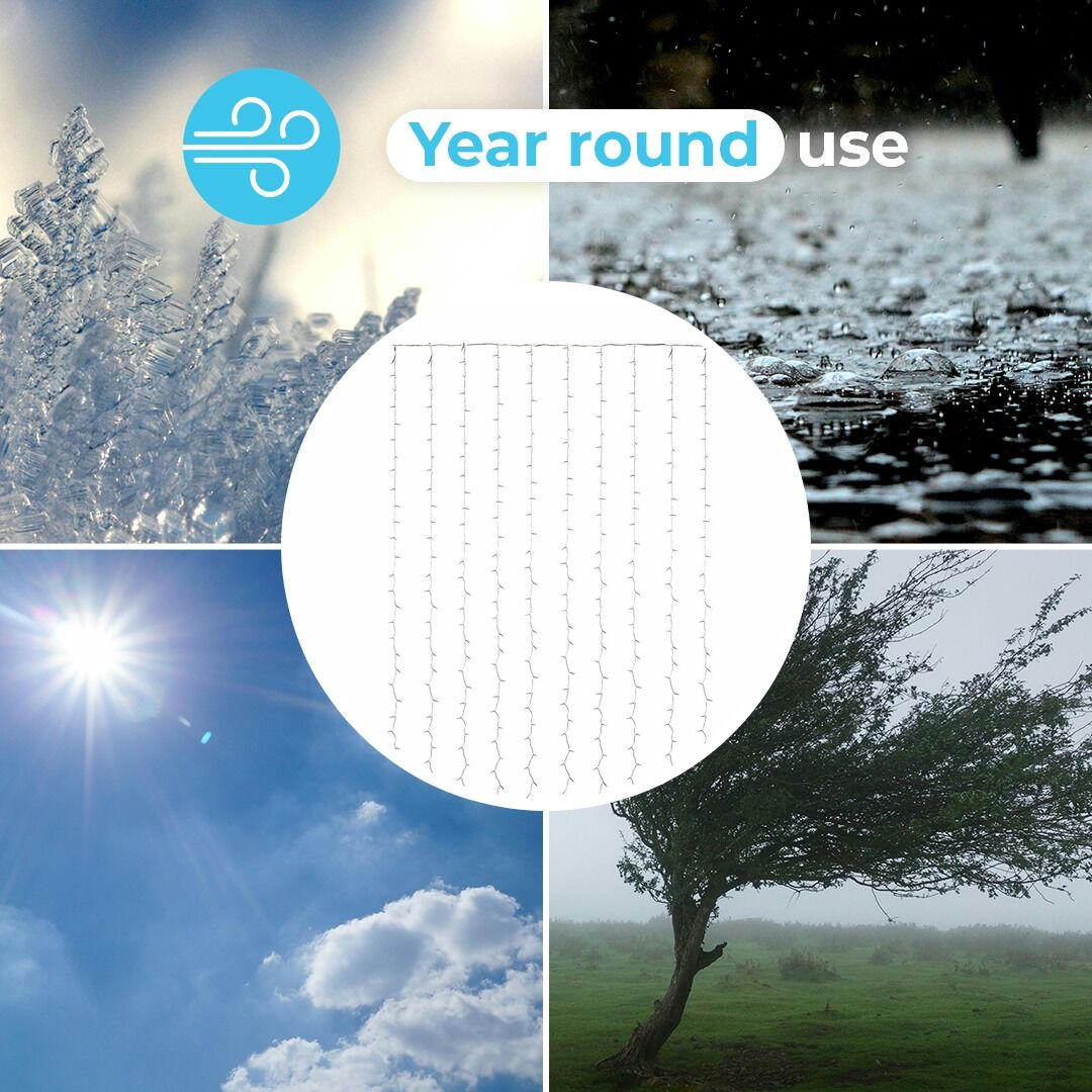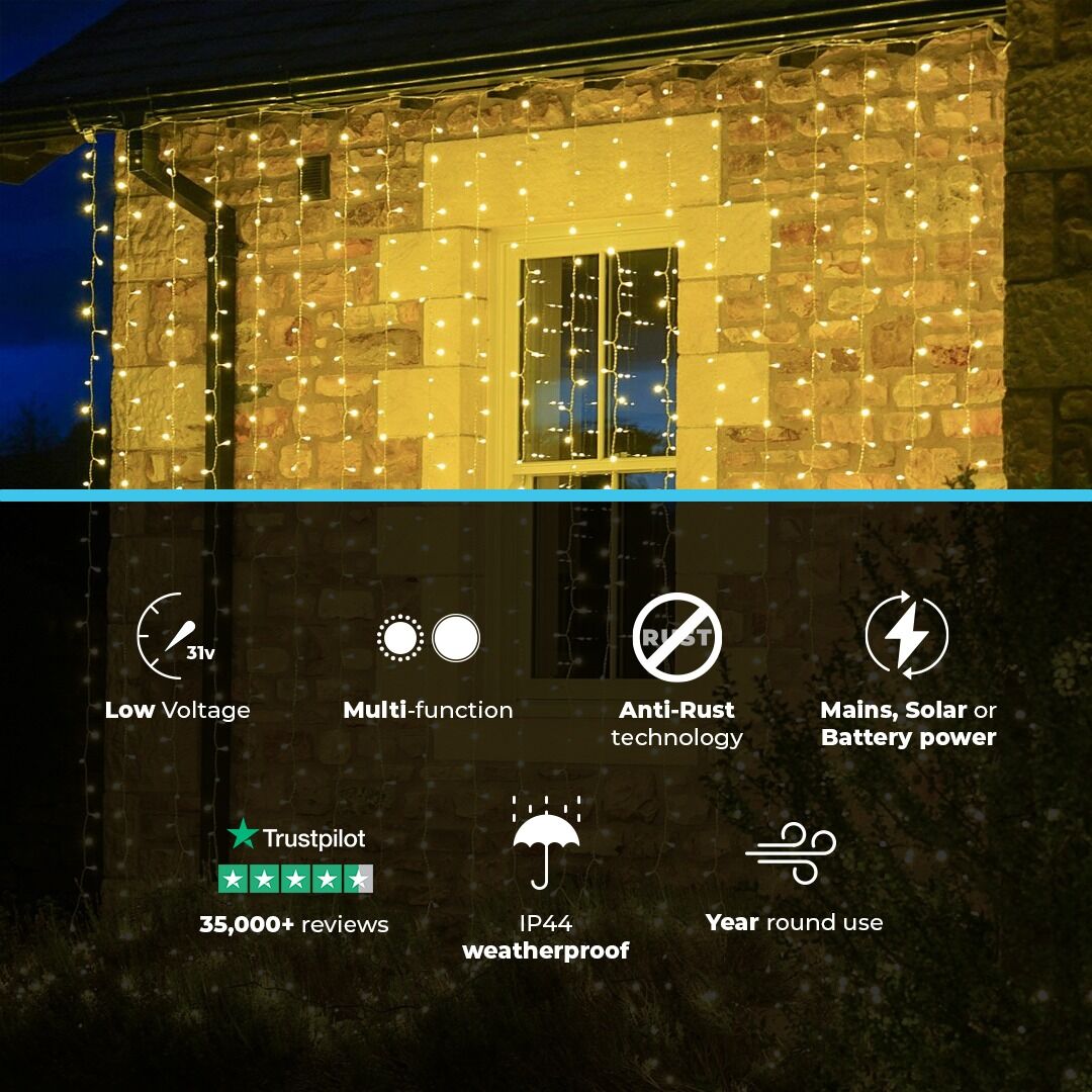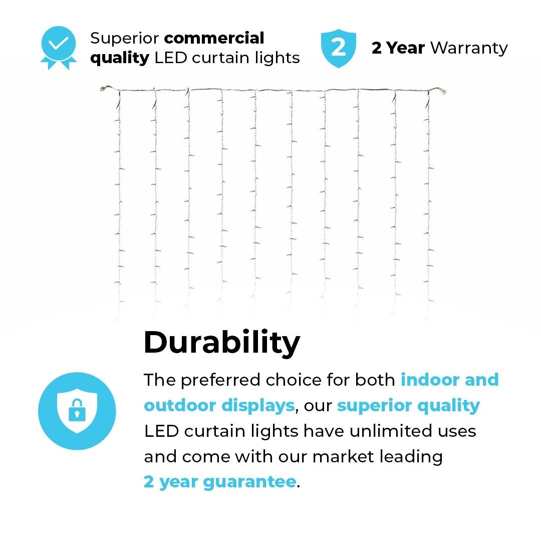 This curtain light measures 2m (W) x 3m (H) and features durable clear PVC cable. This curtain light has 300 LEDs per 2m length, and as part of our ConnectGo connectable lights system, you can continue to add more connectable lights to your chosen power source.