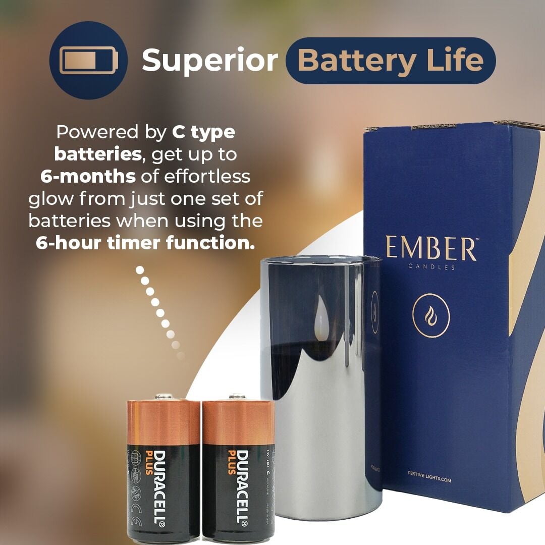 *When left on the 6hr timer in the flickering mode, the candle stays alight for over 180 days before the batteries require changing.