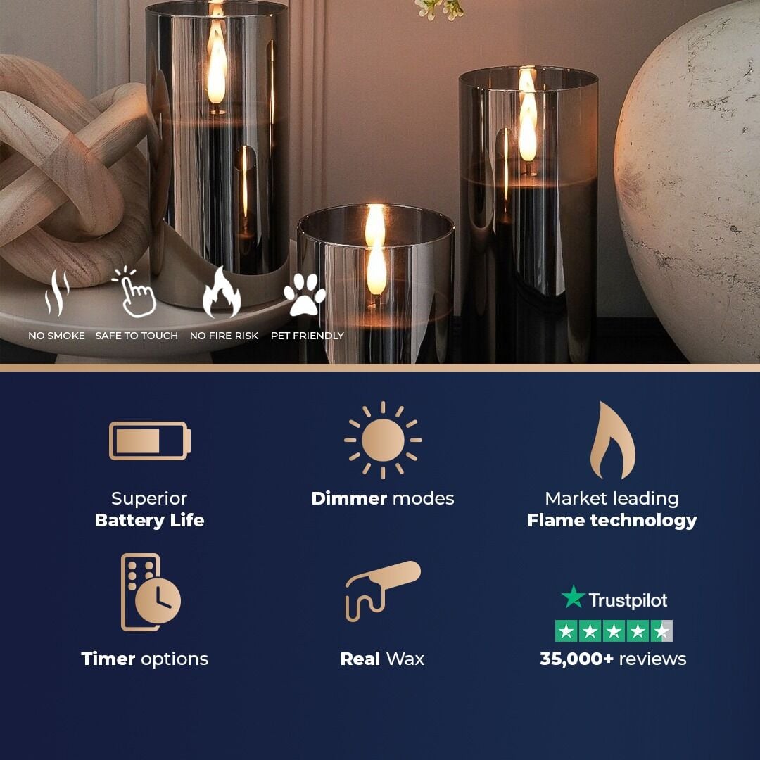 Made from 100% real, hand-poured black wax, this weighted candle is encased in reflective smoked-glass, giving it a modern twist that is sure to stand out within your home. Whether it’s adding a contemporary twist to your living room styling or injecting a warming glow to your bedroom or bathroom, this smoked candle is ideal for adding that undeniable, warming glow we all know and expect from a real candle. Meticulous time and care have been taken to ensure our Hurricane Ember Candle™ range looks as true to life as possible. The flame itself is home to one warm white LED bulb concealed within a frosted ‘flame’, which has been specifically designed to mimic the curve of natural candlelight. The LED gently dances from tip to wick to give the illusion of a soft, realistic burn that flutters softly, reflecting against the smoked glass.