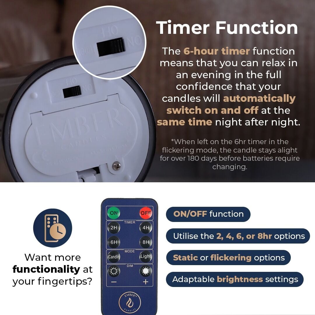 Complete with a handy 6-hour timer function, you can rest easy night after night knowing that your candle will switch on and off automatically each evening while you relax in style. What’s more, each Hurricane Ember Candle™ comes with an optional stylish sticker in Embers™ distinctive navy and gold colour scheme to really help your candle pop. To truly unlock Ember’s™ potential, the purpose-built remote control will bring your new ultra-realistic candle to life. Set a timer, dim your candle, change the function, and switch the candle on, even if the candle is physically switched to ‘off’.
