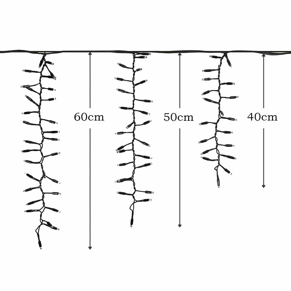 Available in either 2m or 5m lengths, up to 375 warm white static LED bulbs shine brightly into the night on a cold winter’s eve. These lights have specifically been designed to combine two of the seasons best-selling lights in order to create something truly special. The icicle lights alternate between a 60cm, 50cm and 40cm black rubber cabled drop, each of which have been adorned in more light than ever before!