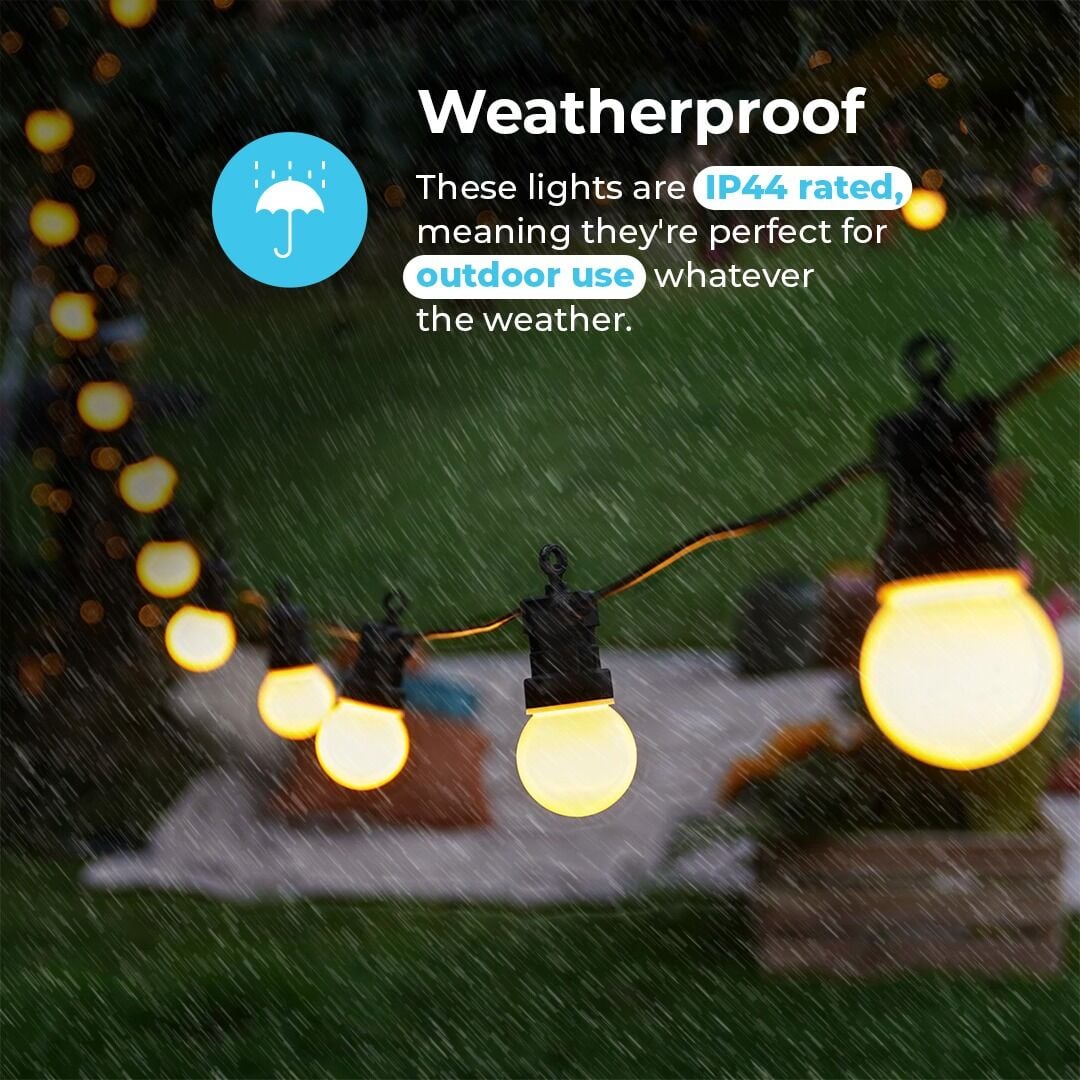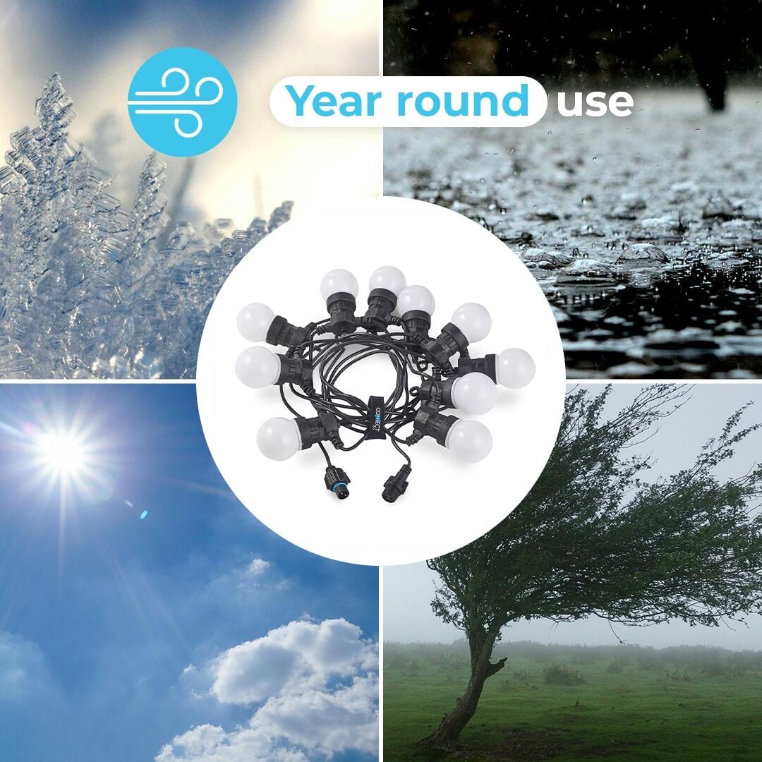 These festoons feature a durable black rubber cable, with an LED spacing of 50cm, and are supplied in multiples of 5 metres; meaning if you order 45m, for example, you will receive nine 5m lengths, ready to be connected together. The lights boast SMD LEDs, in warm white, white or multi-colour, and as part of our ConnectGo connectable lights system, you can continue to add more connectable lights to your chosen power source.