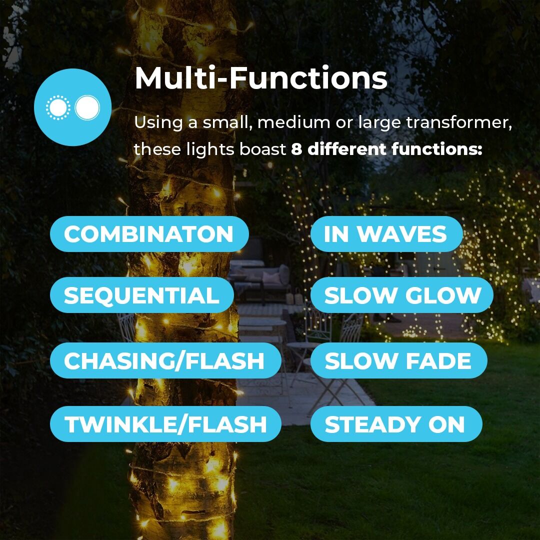 Using a small, medium or large transformer, these lights boast 8 different functions, including: Combination, In Waves, Sequential, Slow-Glow, Flash, Slow Fade, Twinkling, and Steady On. Each time you switch the lights on, the in-built memory chip will automatically select the last function used.
