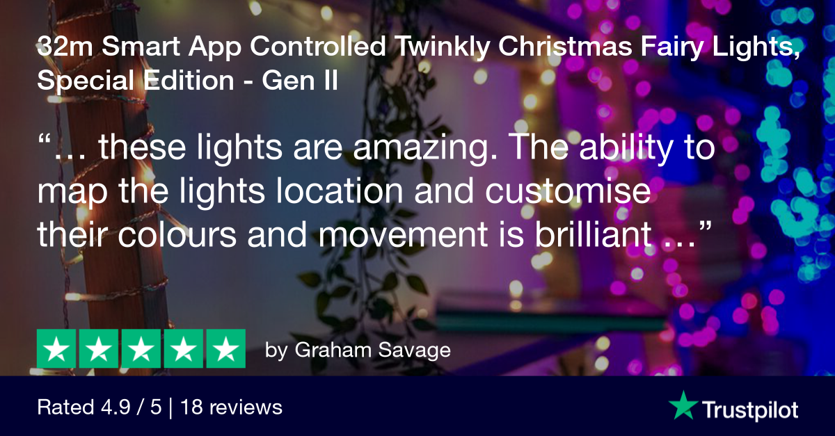 Twinkly’s app-controlled lights have revolutionised the Christmas light market. Set the colour, pattern and effects of you your Twinkly string, icicle, cluster, and even Festoon lights to whatever style suits your fancy. You can even set your lights to music! Create an ambient setting both inside and outside of your home with our range of app controlled lights and twinkly outdoor lights.